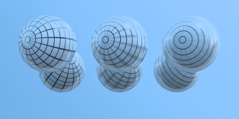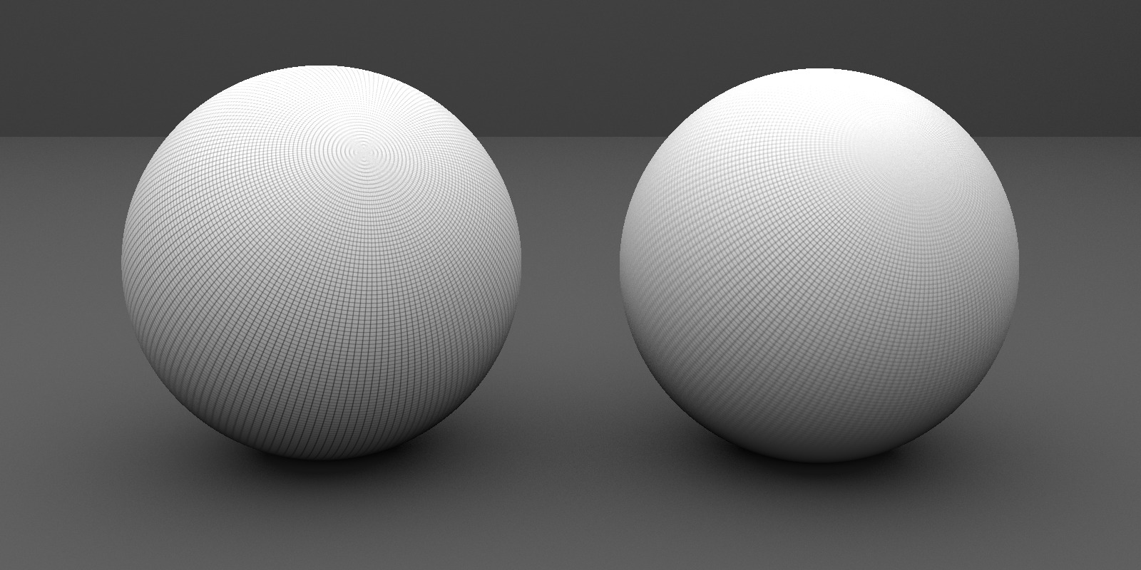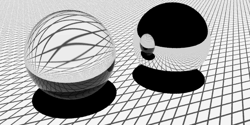| spheres-differentials-texfilt.pbrt: glass (left) and mirror (right) spheres, reflecting high-frequency texture map. Thanks to texture filtering with ray differentials, the reflections of the texture are anti-aliased well. | |