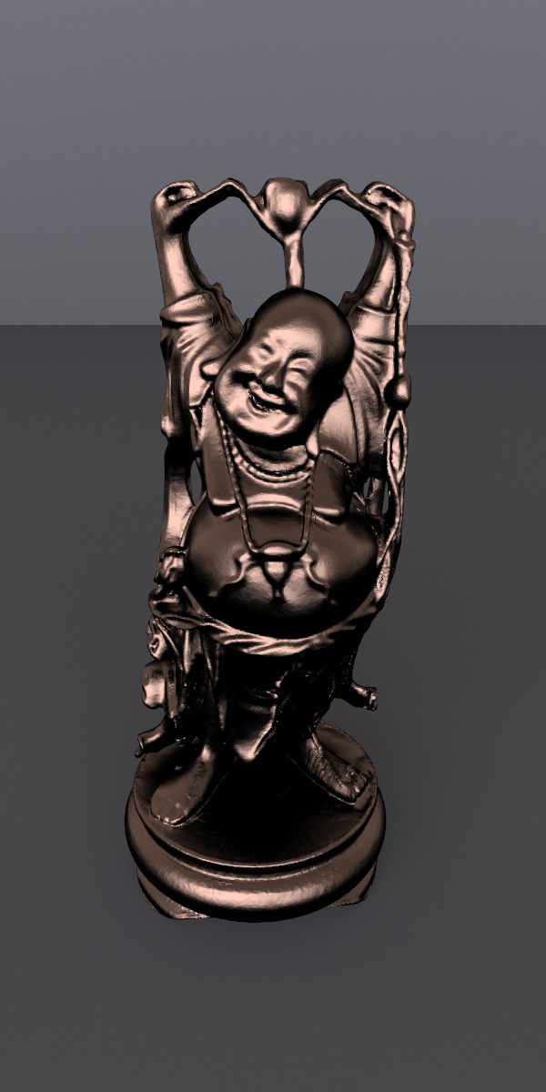 | buddha.pbrt: The "Happy Buddha" model (courtesy of the Stanford 3D Scanning Repository) is rendered with a realistic copper metal model. | |