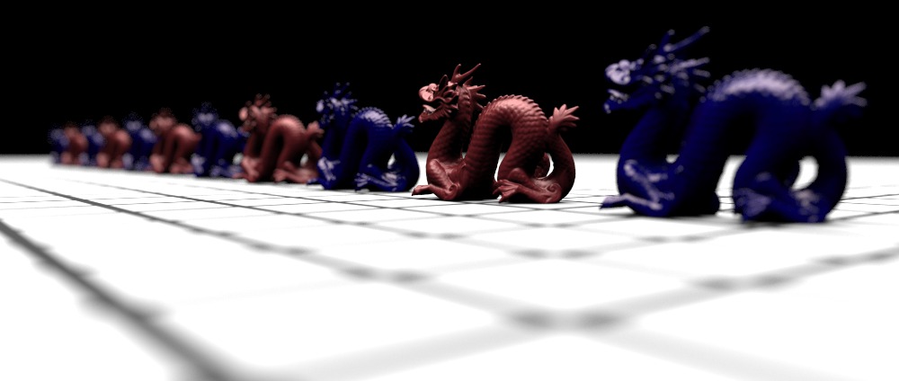 | dof-dragons.pbrt: series of dragon models, illustrating depth of field. (Dragon model courtesy of the Stanford 3D Scanning Repository). | |