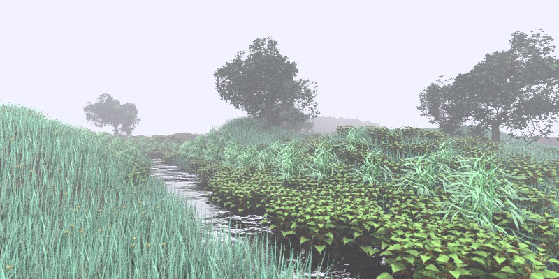 | plants-godrays.pbrt: complex ecosystem model, rendered with atmospheric scattering leading to beams of light. (Model form Deussen et al. Realistic modeling and rendering of plant ecosystems.) | |