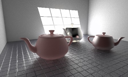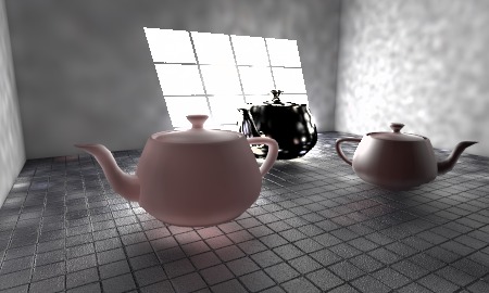 | room-igi.pbrt: simple scene of a room with teapots with a variety of reflection models, rendered using the "instant global illumination" algorithm. Most of the illumination in this scene is indirect; the illumination on the back wall is the only direct lighting. | |