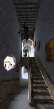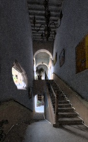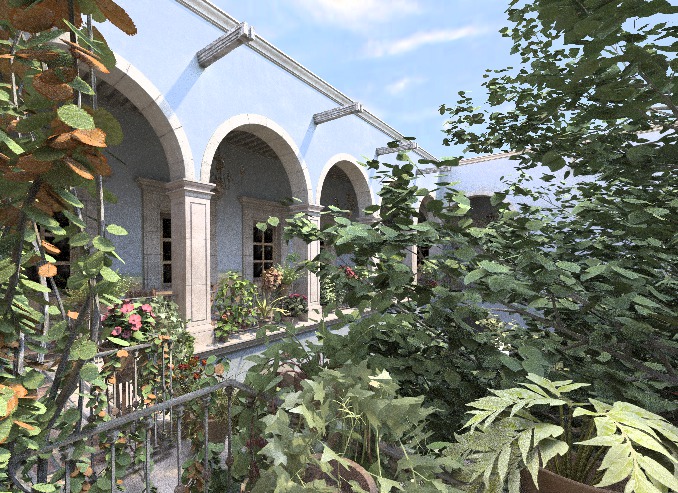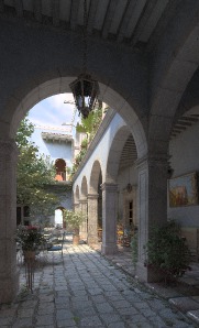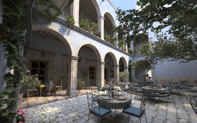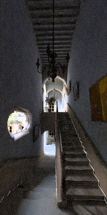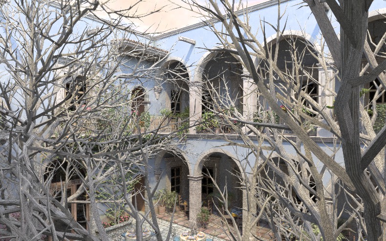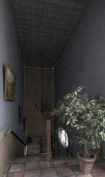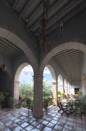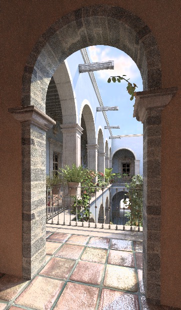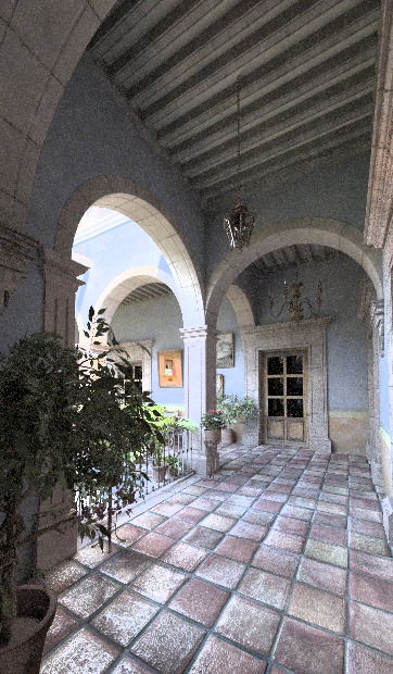| sanmiguel.pbrt: this scene was modeled by Guillermo M. Leal Llaguno of Evolución Visual, based on a hacienda that he visited in San Miguel de Allende, Mexico. The scene was modeled in 3ds max and exported to the pbrt file format with a custom script written by Guillermo. The scene features just over 2.5 million unique triangles and has a total geometric complexity of 10.7 million triangles due to the use of object instancing; the pbrt files that describe the scene geometry require 620 MB of on-disk storage. There are a total of 354 texture maps, representing 293 MB of texture data. | |