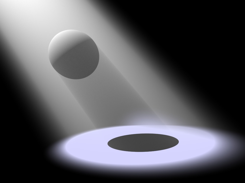 | spotfog.pbrt: spotlight shining through a scattering medium. The sphere casts a volumetric shadow. | |