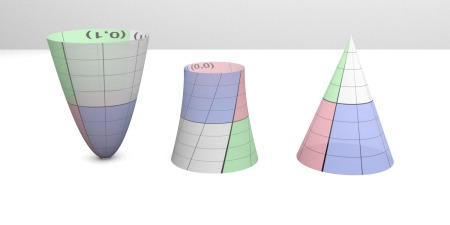 | miscquads.pbrt: various quadrilateral shapes--paraboloid, hyperboloid, and cone--rendered with a texture that illustrates their parameterizations. | |