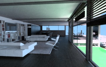 | villa-daylight.pbrt: modern villa scene during daytime, rendered using Metropolis light transport. This is an extremely difficult model to render for many light transport algorithms: because almost all illumination passes through one or more glass windows before illuminating the interior, traditional efficient direct lighting techniques aren't useful for this scene. Model courtesy of Florent Boyer. | |